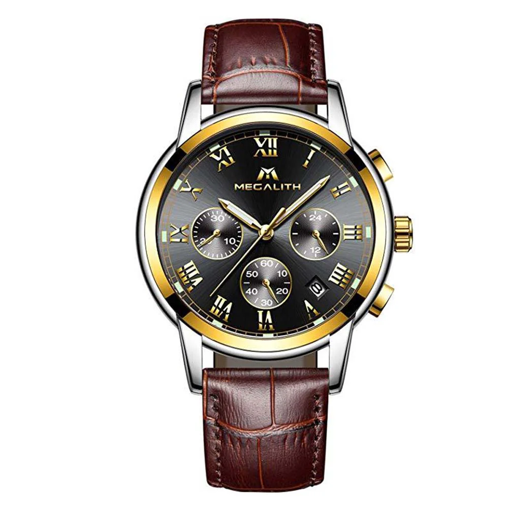 Megalith 0060m men watches with brown leather strap, cool look of the round case & golddial and the puristic and clear line of the quartz chronograph watch designed complement each other ideally and guarantee a glittering appearance.