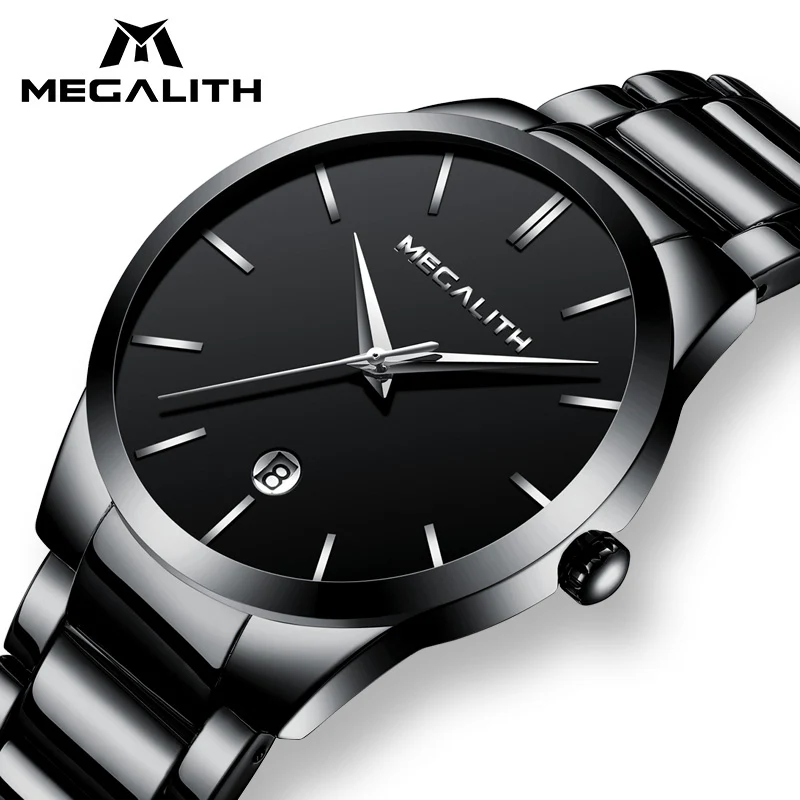 Megalith 0072m men watches with black stainless steel strap, cool look of the round case& black dial and the puristic and clear line of the quartz watch designed complement each other ideally and guarantee a glittering appearance.