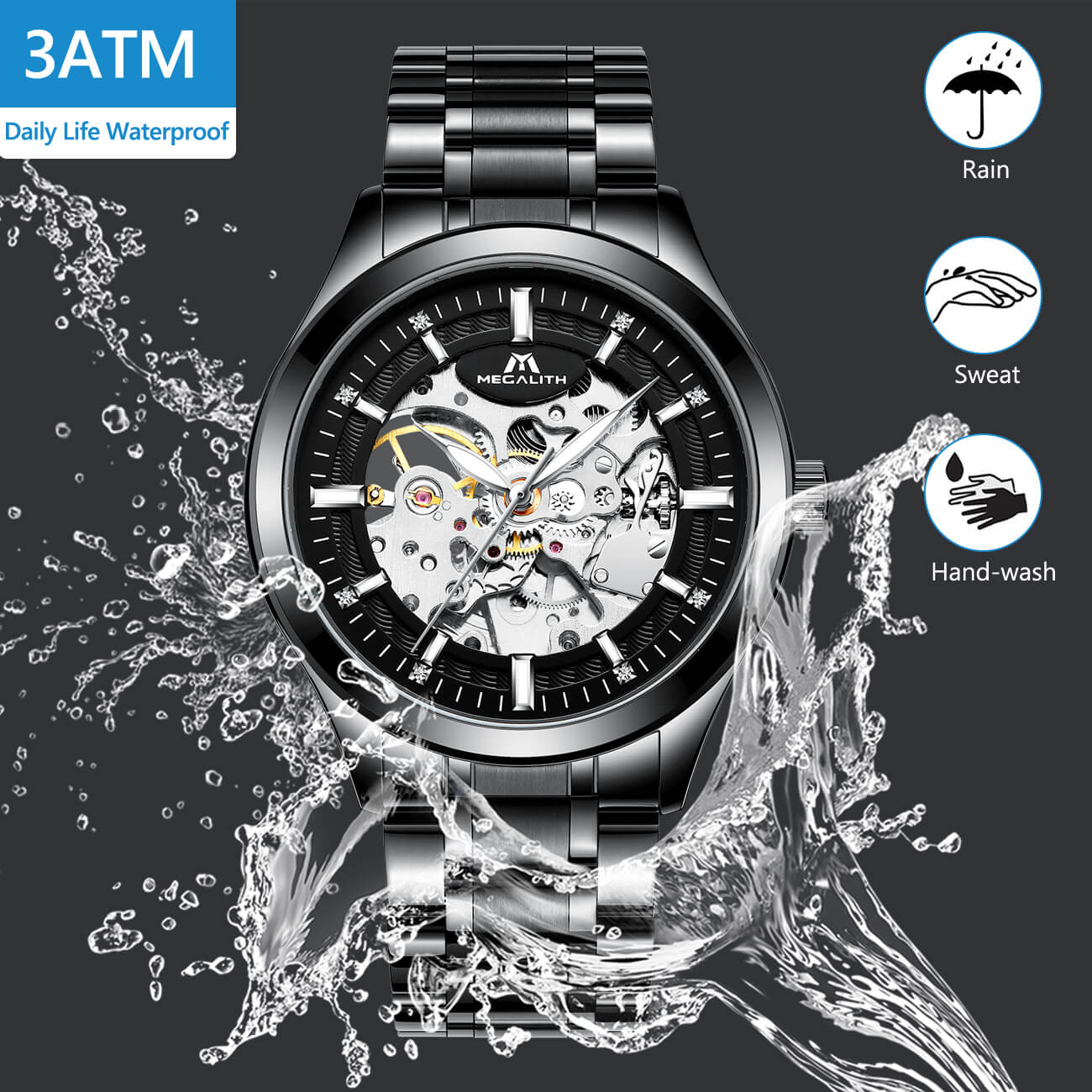 Megalith 8045m men watches with black stainless steel strap, cool look of the round case&hollow watch dial and the puristic and clear line of the quartz chronograph watch designed complement each other ideally and guarantee a glittering appearance.