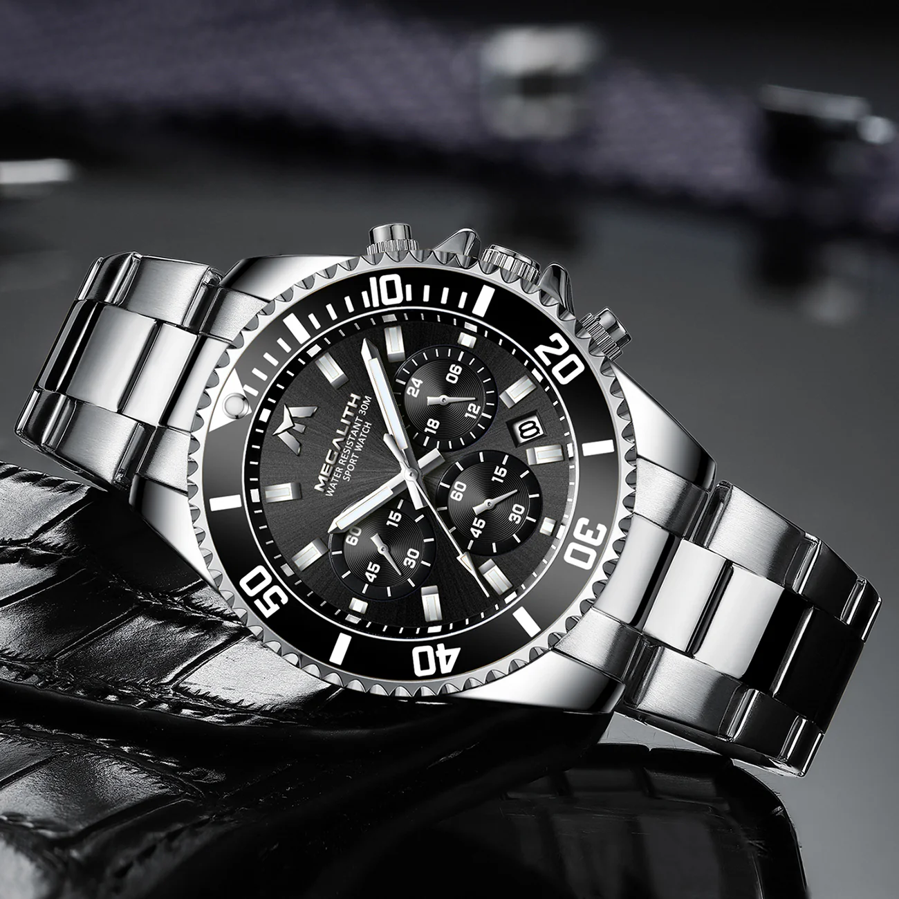 Megalith 8046m men watches with stainless steel strap, cool look of the round case& sub-dial and the puristic and clear line of the quartz chronograph watch designed complement each other ideally and guarantee a glittering appearance.