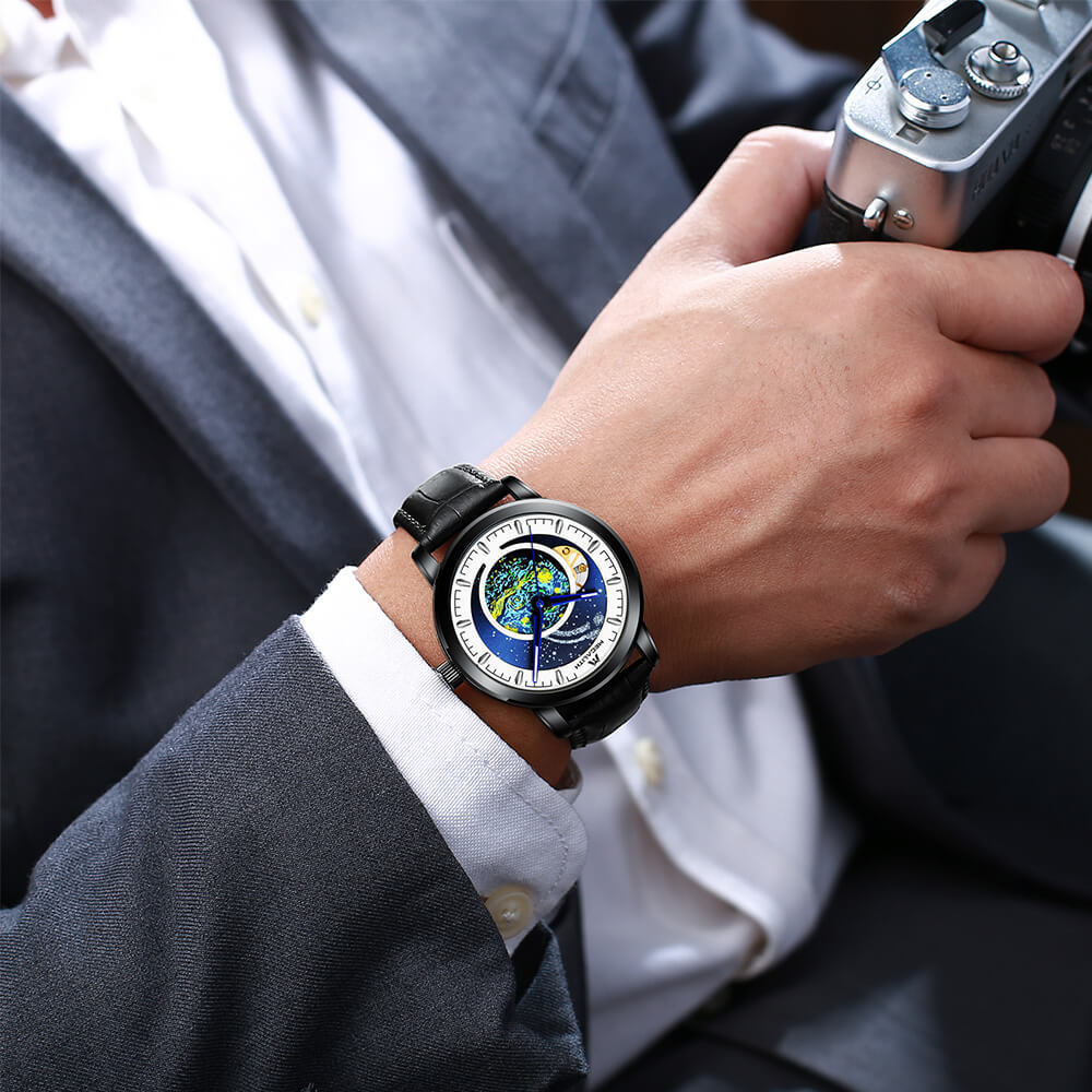 Megalith 8213m men watches with black leather strap, cool look of Van Gogh's Starry Sky & blue dial and the puristic and clear line of the Mechanical watch designed complement each other ideally and guarantee a glittering appearance.