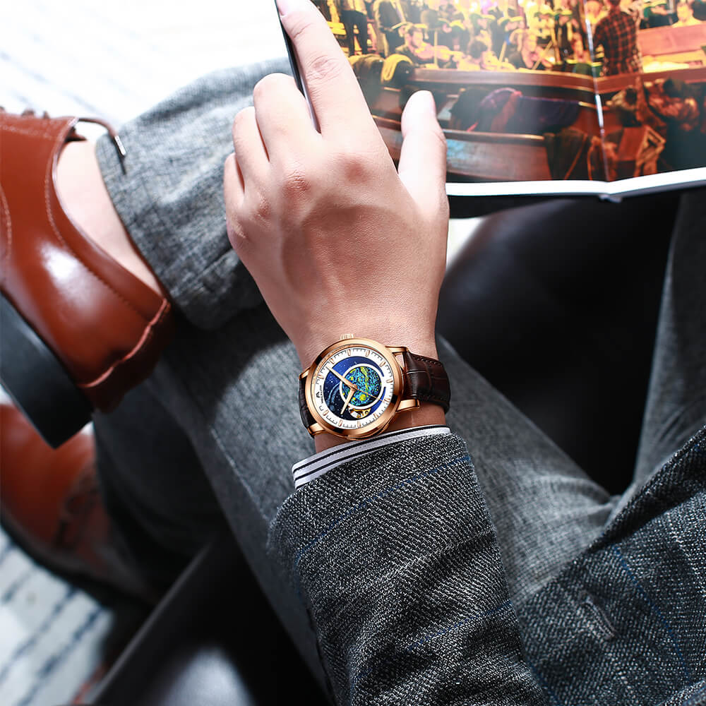 Megalith 8213m men watches with brown leather strap, cool look of Van Gogh's Starry Sky & blue dial and the puristic and clear line of the Mechanical watch designed complement each other ideally and guarantee a glittering appearance.