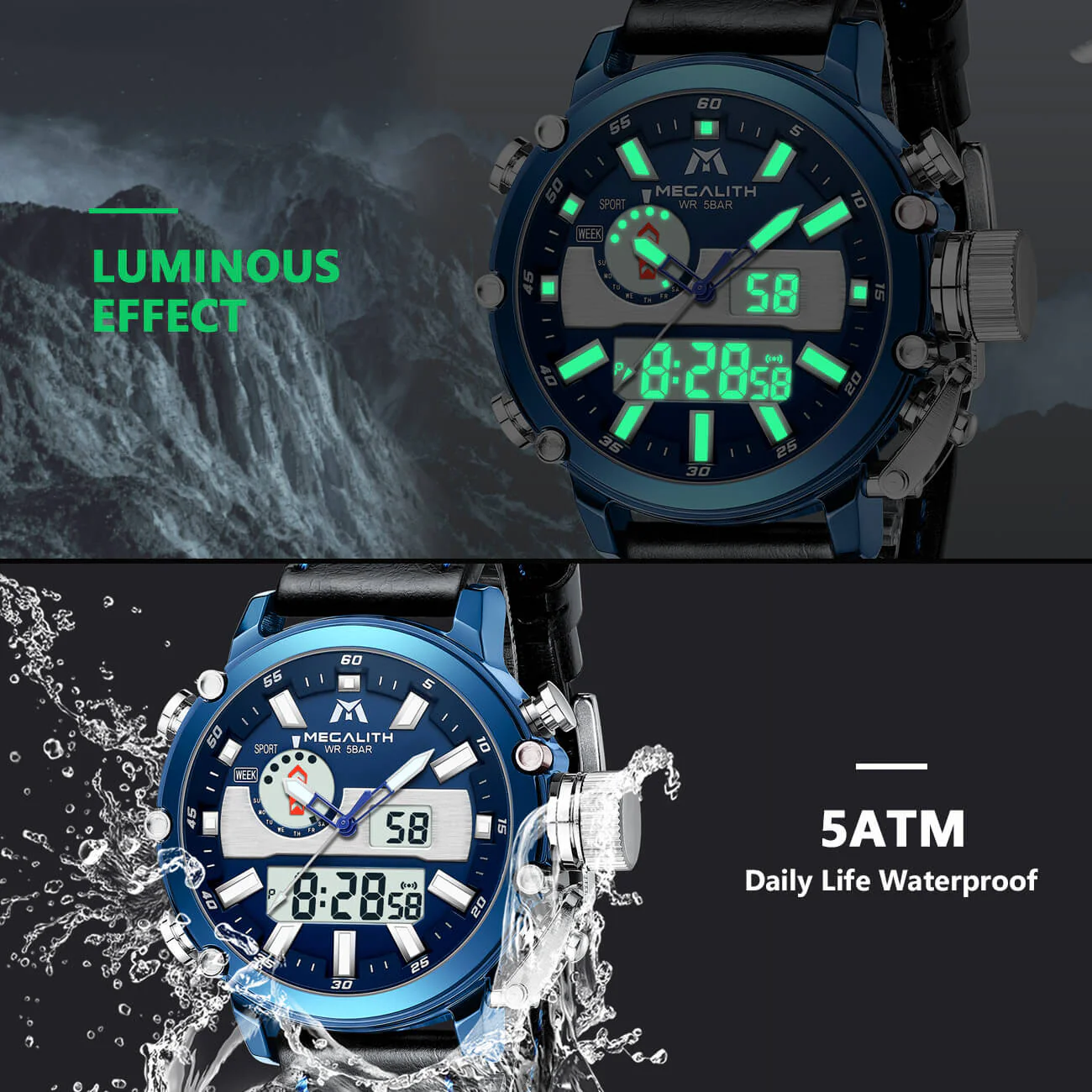 Megalith 8229m men watches with black leather strap, cool look of the round blue case&blue dial and the puristic and clear line of the quartz -digital watch designed complement each other ideally and guarantee a glittering appearance.